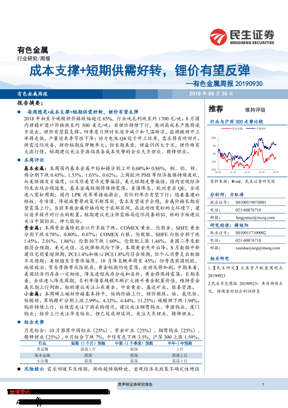 【民生证券】【20190930】20190930-民生证券-有色金属周报:成本支撑+短期供需好转,锂价有望反弹-31页