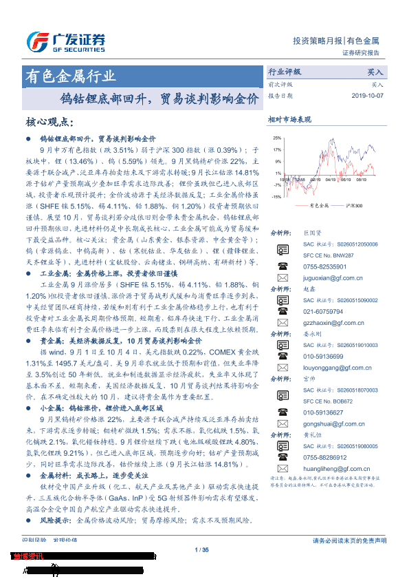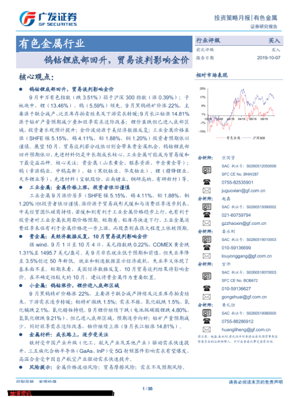 【广发证券】【20191007】20191007-广发证券-有色金属行业投资策略月报:钨钴锂底部回升,贸易谈判影响金价-35页