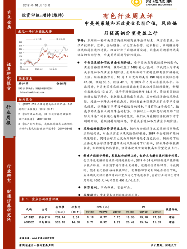 【财通证券】【20191013】有色行业周点评:中美关系缓和不改黄金长期价值,风险偏好提高铜价望受益上行-2页