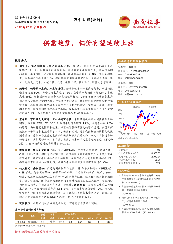 【西南证券】【20191009】小金属行业专题报告:供需趋紧,钼价有望延续上涨-21页