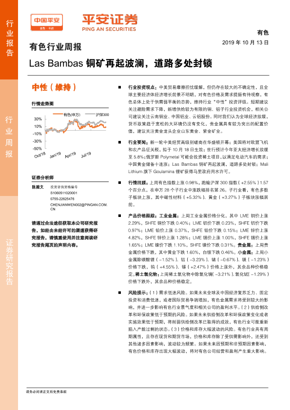 【平安证券】【20191013】有色行业周报:Las Bambas铜矿再起波澜,道路多处封锁-5页