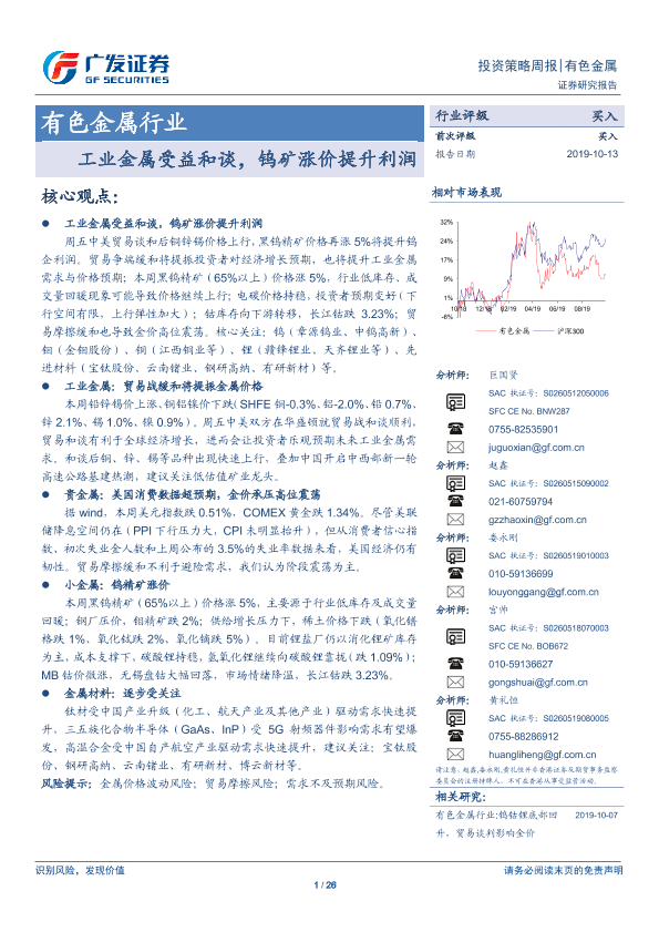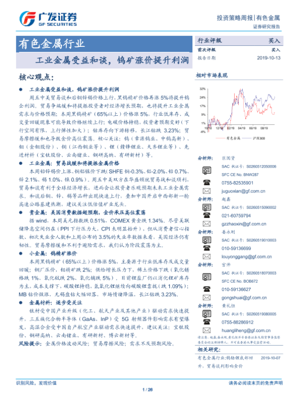 【广发证券】【20191013】有色金属行业:工业金属受益和谈,钨矿涨价提升利润-26页