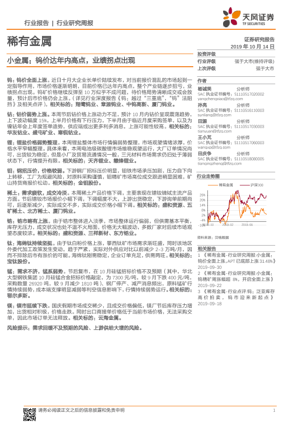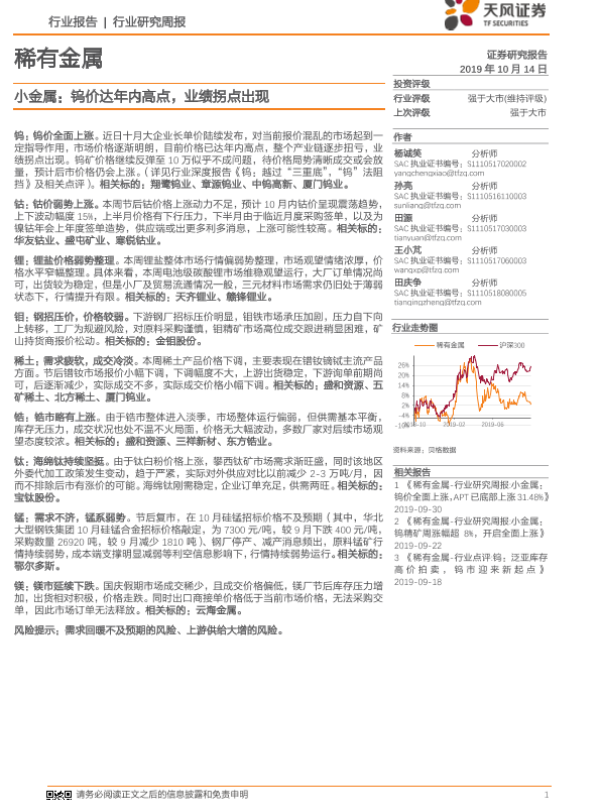 【天风证券】【20191014】20191014-天风证券-稀有金属行业研究周报:小金属:钨价达年内高点,业绩拐点出现-16页