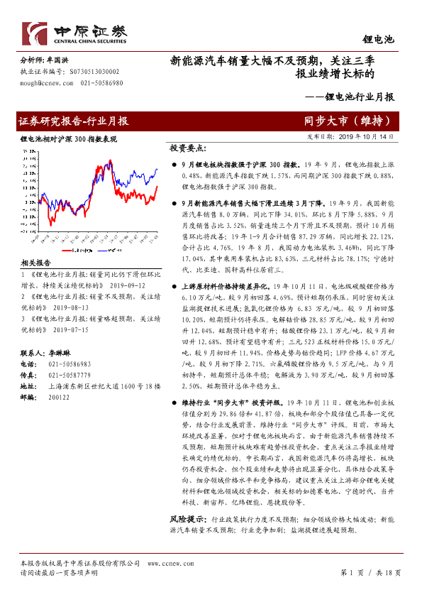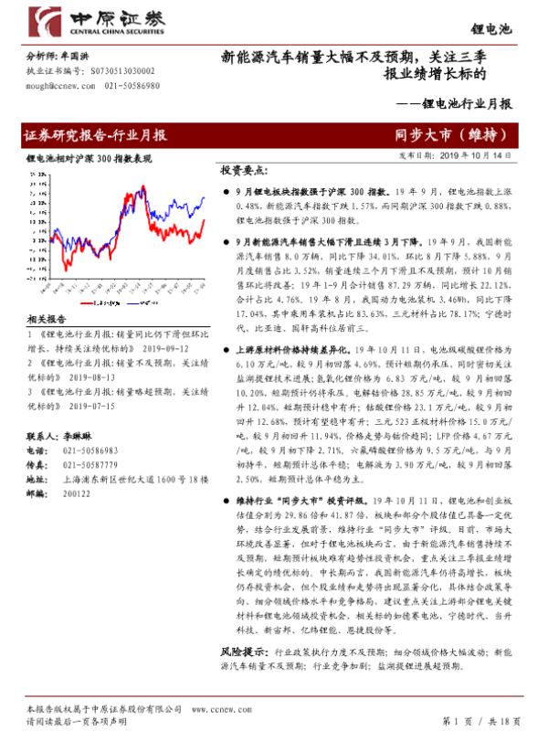 【中原证券】【20191014】锂电池行业月报:新能源汽车销量大幅不及预期,关注三季报业绩增长标的-18页