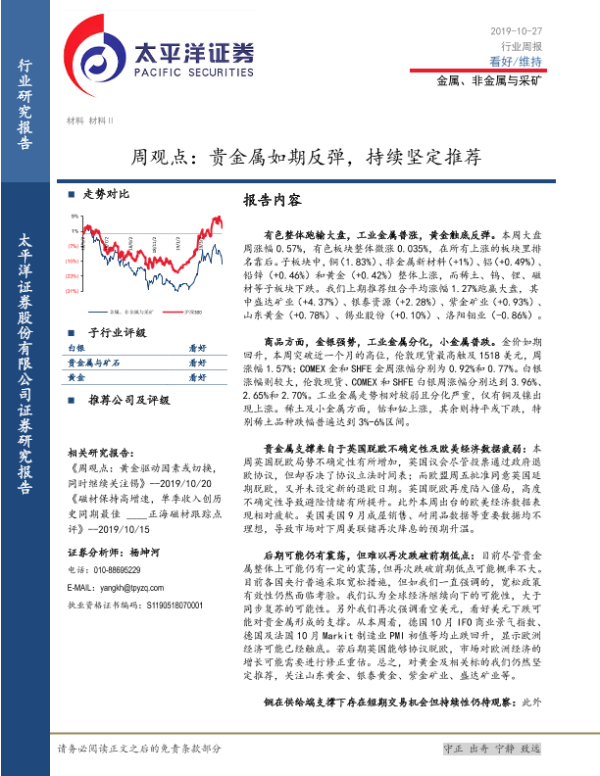 【太平洋证券】【20191027】20191027-太平洋-金属、非金属与采矿周观点:贵金属如期反弹,持续坚定推荐-4页