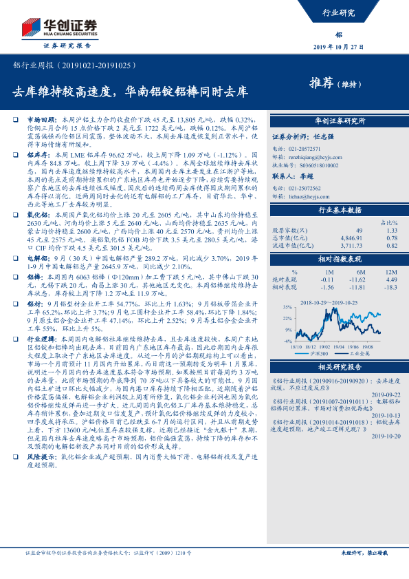 【华创证券】【20191027】铝行业周报:去库维持较高速度,华南铝锭铝棒同时去库-21页