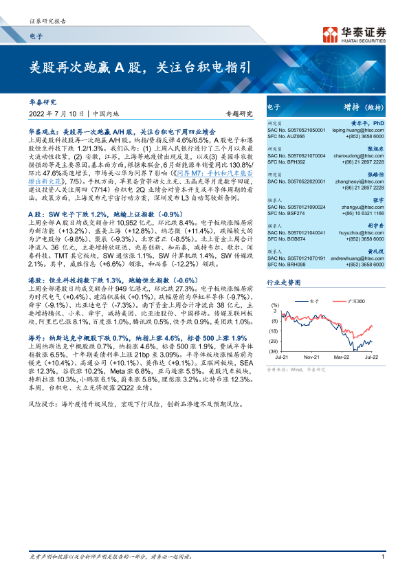 【华泰证券】【20220710】电子行业专题研究:美股再次跑赢A股,关注台积电指引-21页