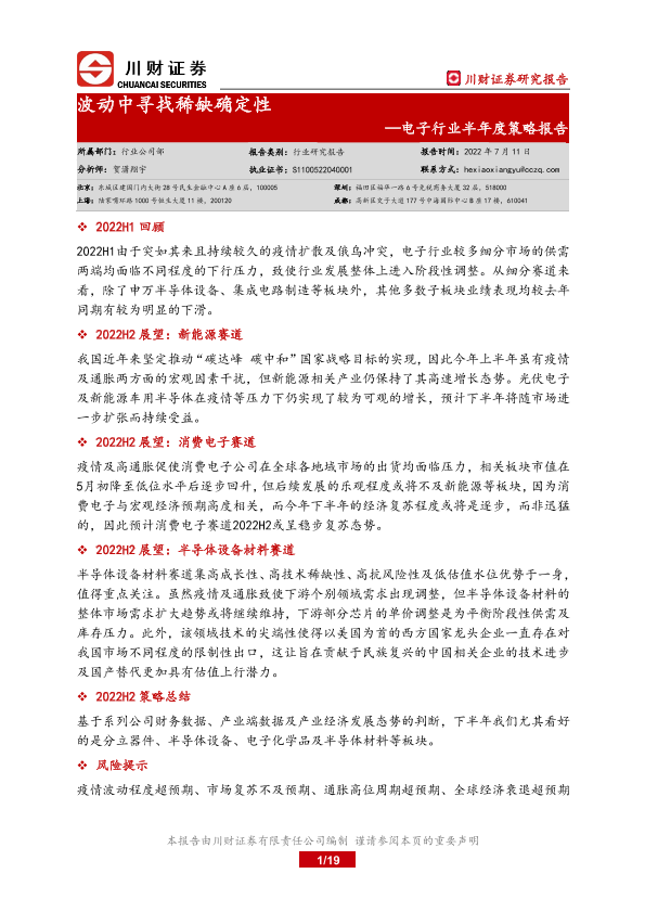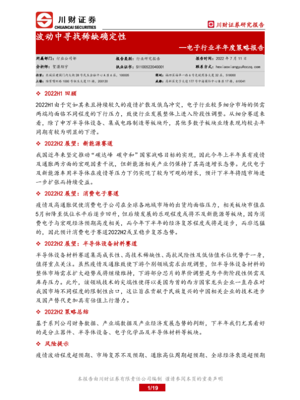 【川财证券】【20220711】电子行业半年度策略报告:波动中寻找稀缺确定性-19页
