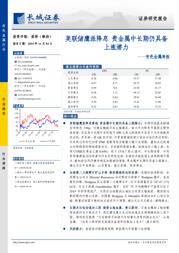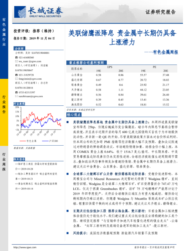 【长城证券】【20191104】20191104-长城证券-有色金属周报:美联储鹰派降息 贵金属中长期仍具备上涨潜力-11页