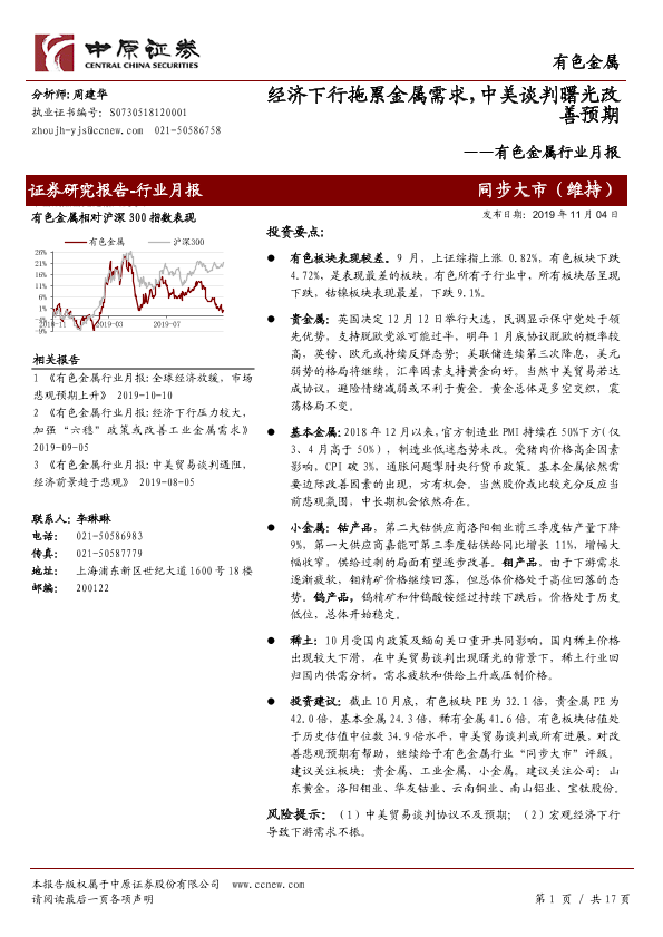 【中原证券】【20191104】有色金属行业月报:经济下行拖累金属需求,中美谈判曙光改善预期-17页