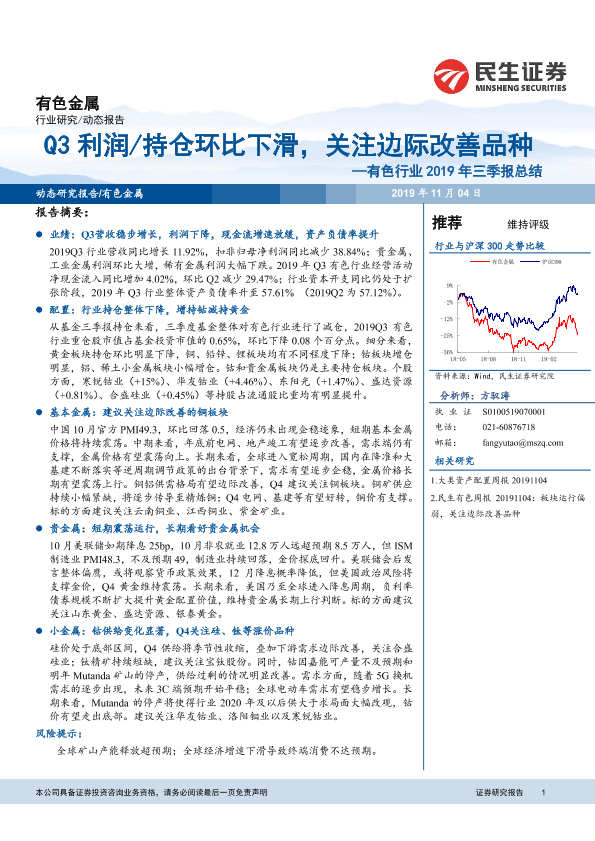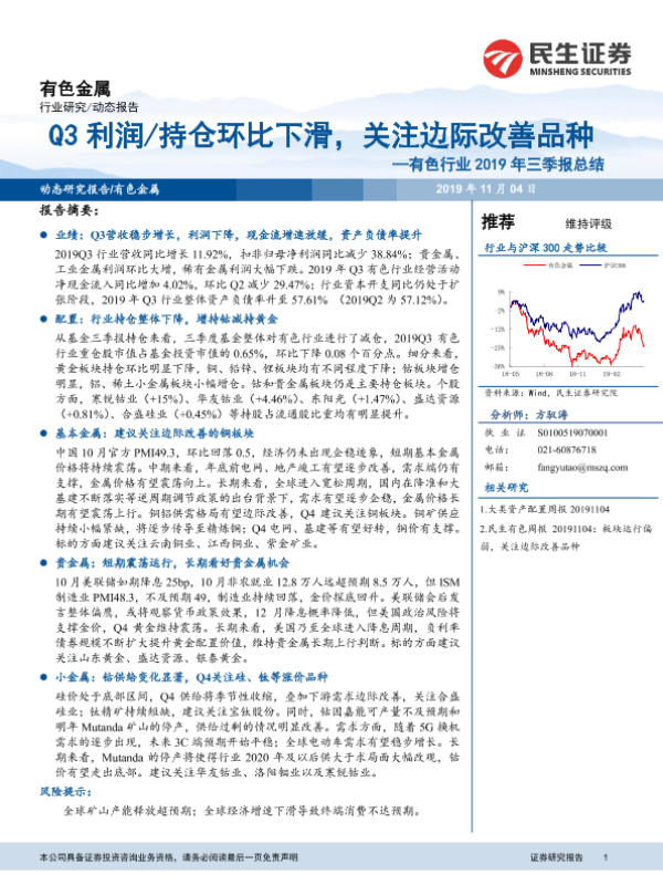 【民生证券】【20191104】有色行业2019年三季报总结:Q3利润/持仓环比下滑,关注边际改善品种-16页