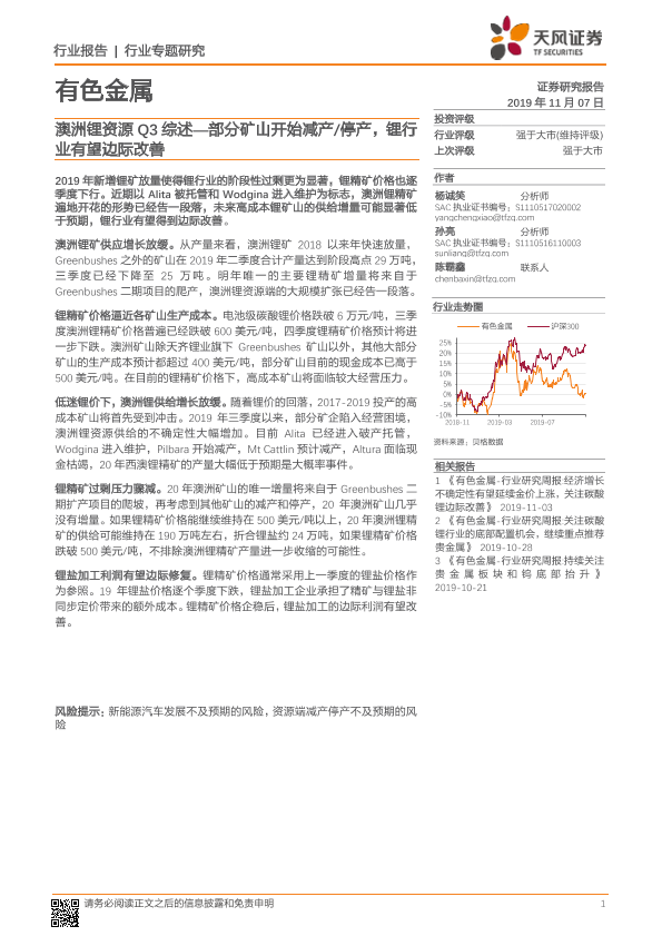 【天风证券】【20191107】20191107-天风证券-有色金属行业专题研究:澳洲锂资源Q3综述—部分矿山开始减产 停产,锂行业有望边际改善-7页
