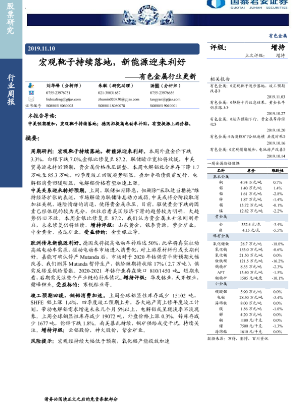 【国泰君安证券】【20191110】宏观靴子持续落地,新能源迎来利好——有色金属行业更新-13页