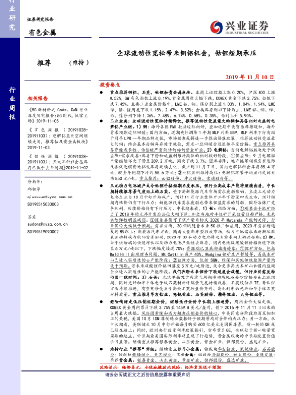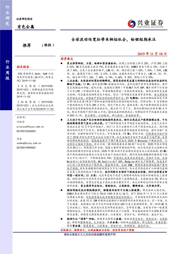 【兴业证券】【20191110】全球流动性宽松带来铜铝机会,钴锂短期承压-13页