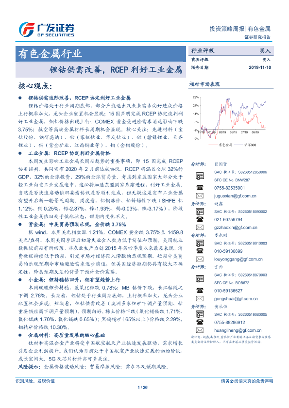 【广发证券】【20191110】有色金属行业投资策略周报:锂钴供需改善,RCEP利好工业金属-26页