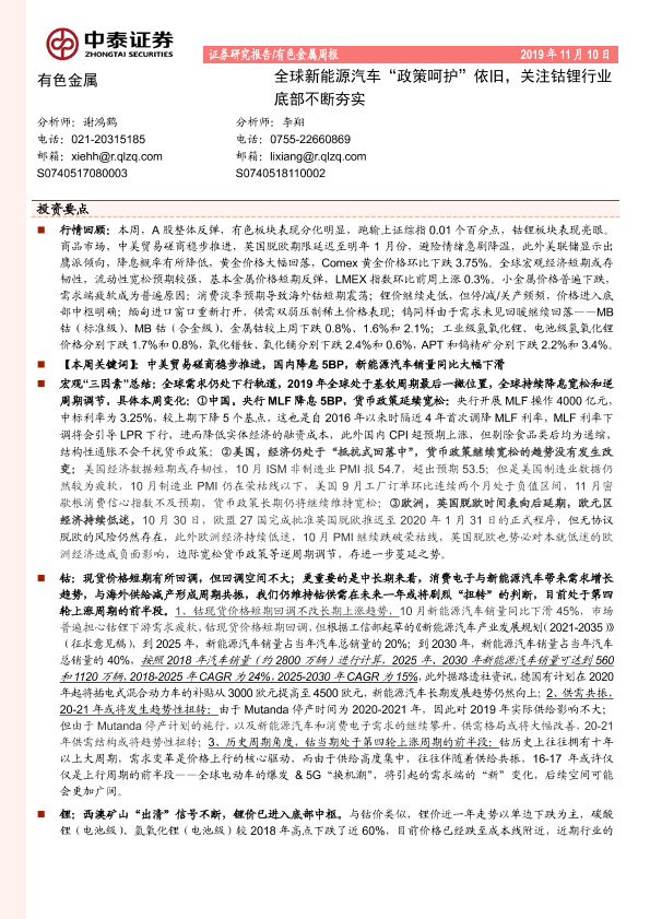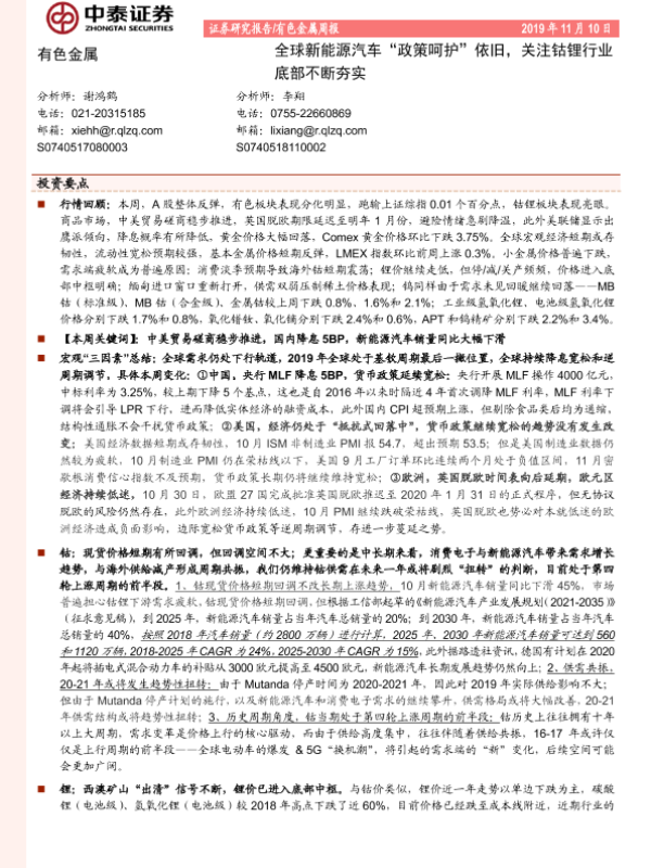 【中泰证券】【20191110】全球新能源汽车“政策呵护”依旧,关注钴锂行业底部不断夯实-28页