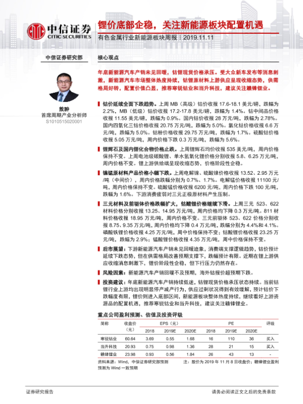 【中信证券】【20191111】20191111-中信证券-有色金属行业新能源板块周报:锂价底部企稳,关注新能源板块配置机遇-13页