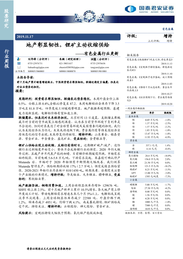 【国泰君安证券】【20191117】20191117-国泰君安-有色金属行业更新:地产彰显韧性,锂矿主动收缩供给-13页