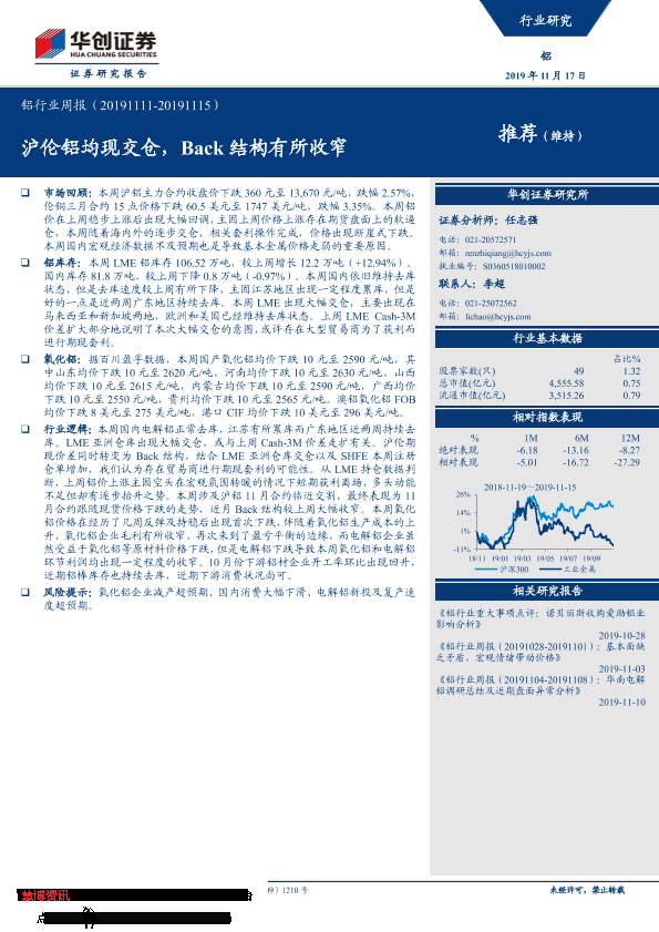 【华创证券】【20191117】20191117-华创证券-铝行业周报:沪伦铝均现交仓,Back结构有所收窄-21页