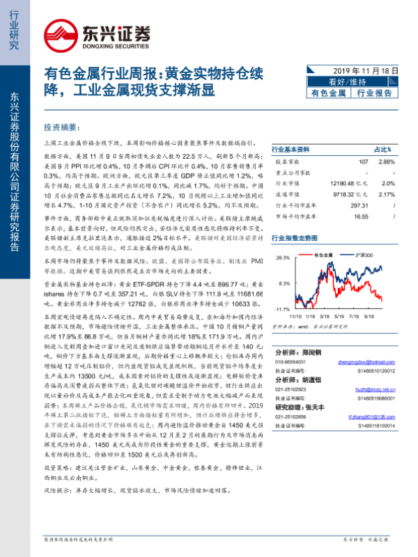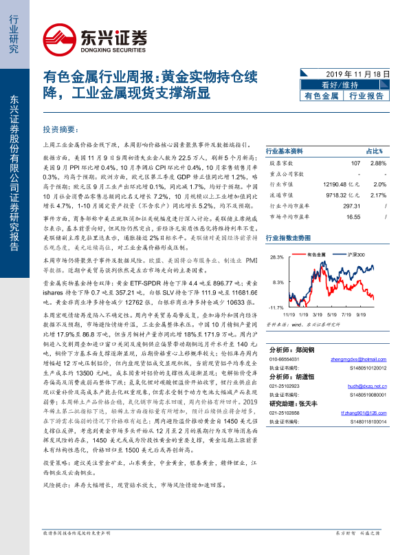 【东兴证券】【20191118】20191118-东兴证券-有色金属行业周报:黄金实物持仓续降,工业金属现货支撑渐显-16页