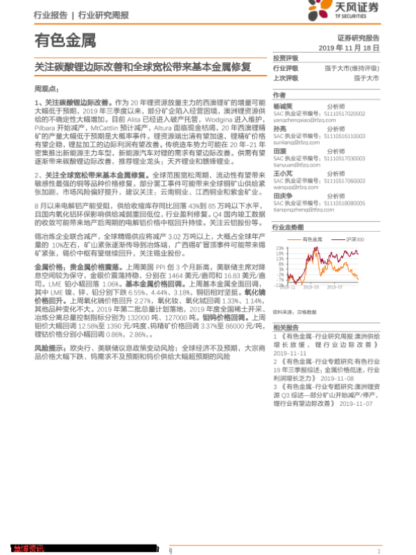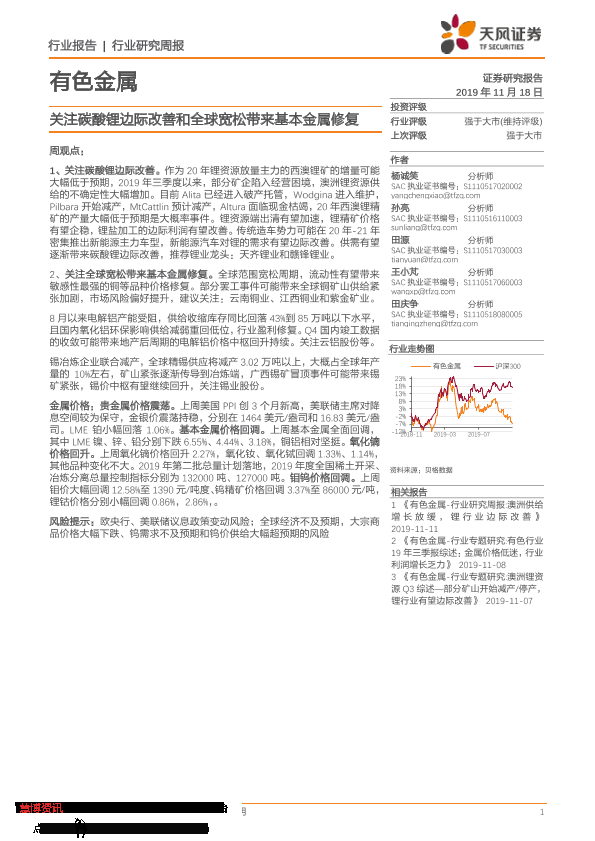 【天风证券】【20191118】20191118-天风证券-有色金属行业研究周报:关注碳酸锂边际改善和全球宽松带来基本金属修复-13页