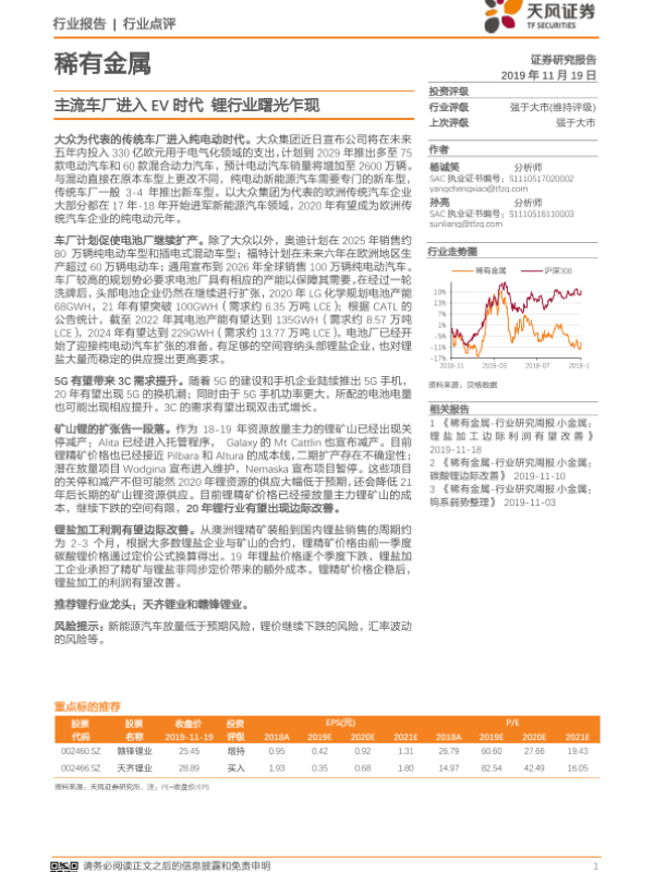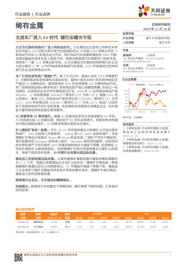 【天风证券】【20191119】稀有金属行业点评:主流车厂进入EV时代 锂行业曙光乍现-2页