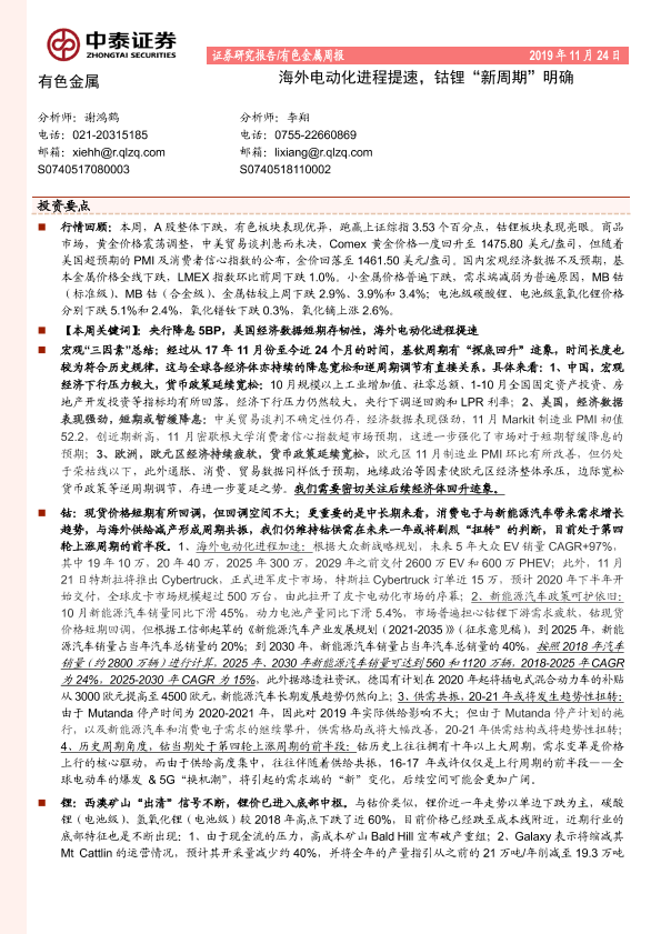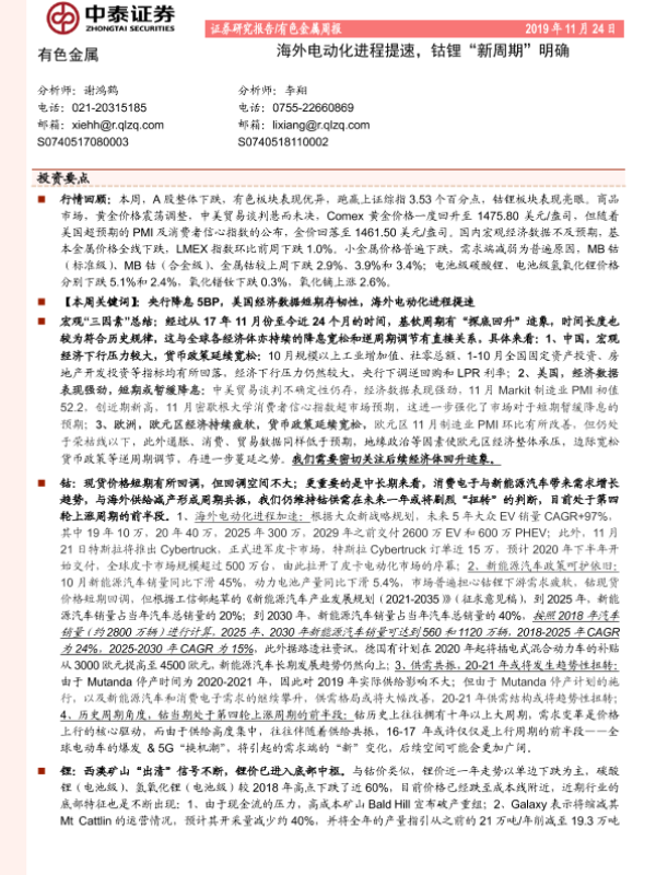 【中泰证券】【20191124】20191124-中泰证券-有色金属周报:海外电动化进程提速,钴锂“新周期”明确-29页