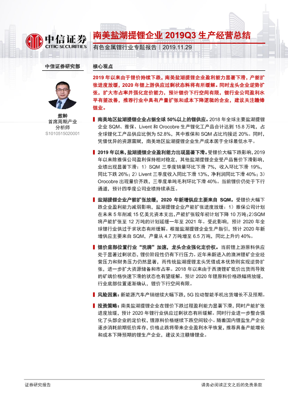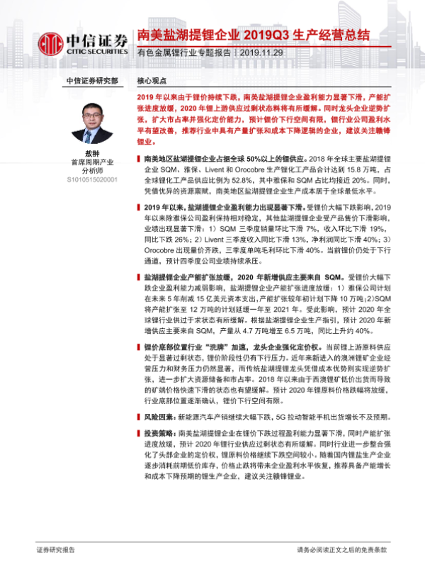 【中信证券】【20191129】20191129-中信证券-有色金属锂行业专题报告:南美盐湖提锂企业2019Q3生产经营总结-15页