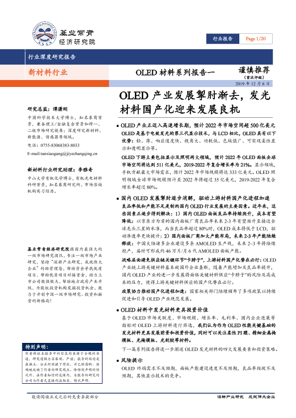 【基业常青经济研究院】【20191206】OLED材料系列报告一:OLED产业发展掣肘渐去,发光材料国产化迎来发展良机-20页
