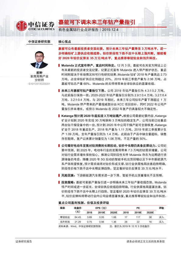 【中信证券】【20191204】有色金属钴行业点评报告:嘉能可下调未来三年钴产量指引-2页