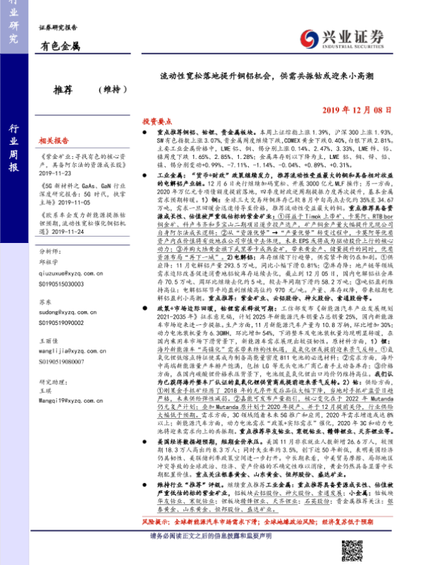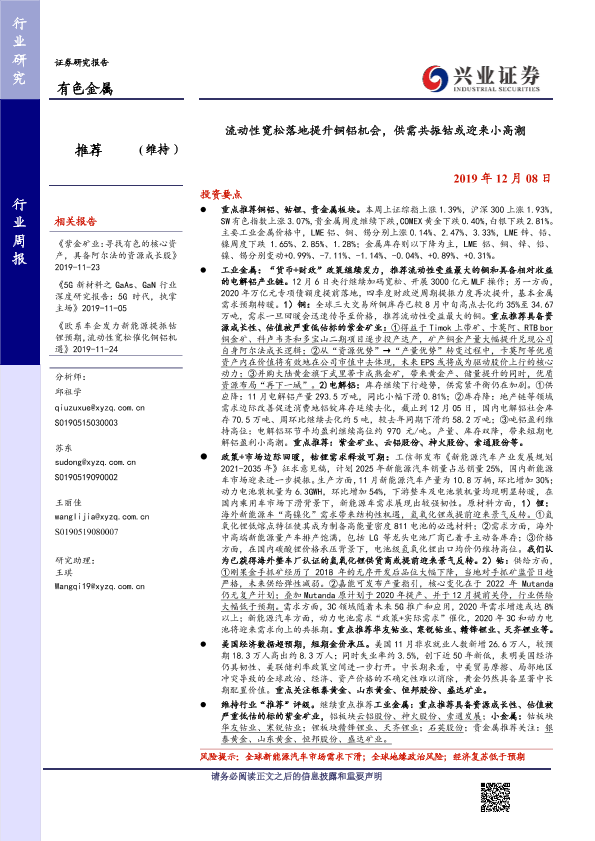 【兴业证券】【20191208】20191208-兴业证券-有色金属行业周报:流动性宽松落地提升铜铝机会,供需共振钴或迎来小高潮-12页