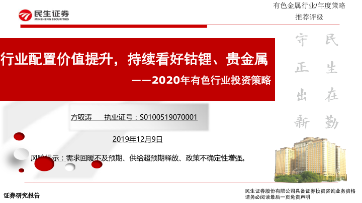 【民生证券】【20191209】2020年有色行业投资策略:行业配置价值提升,持续看好钴锂、贵金属-53页