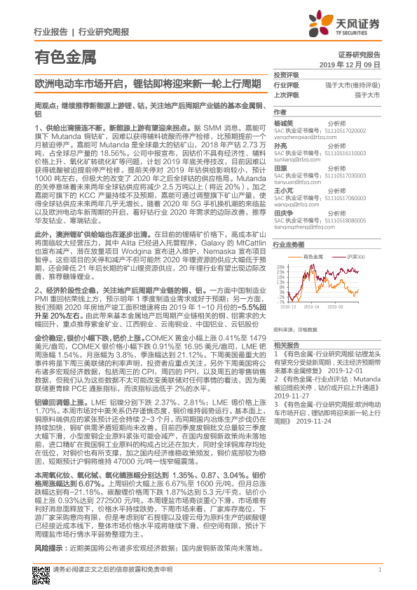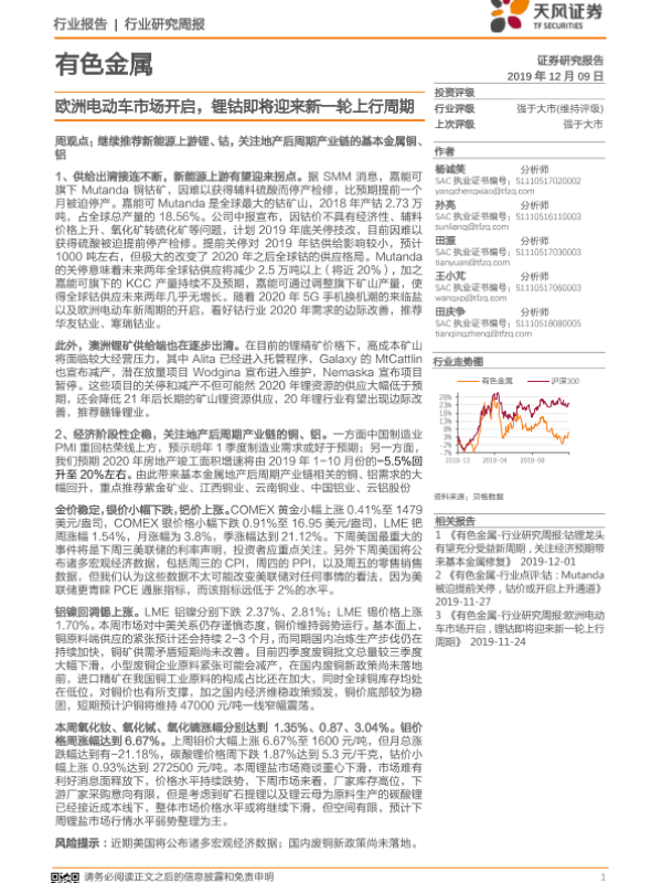 【天风证券】【20191209】20191209-天风证券-有色金属行业研究周报:欧洲电动车市场开启,锂钴即将迎来新一轮上行周期-20页