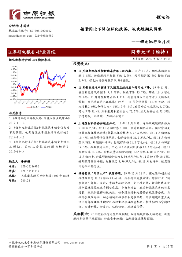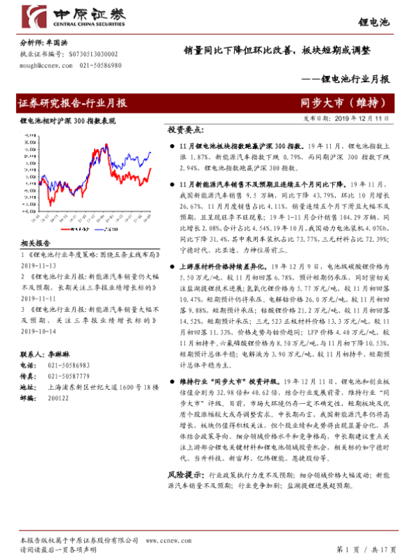 【中原证券】【20191211】锂电池行业月报:销量同比下降但环比改善,板块短期或调整-17页