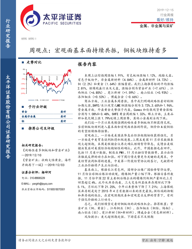 【太平洋证券】【20191215】20191215-太平洋-金属、非金属与采矿周观点:宏观面基本面持续共振,铜板块维持看多-3页