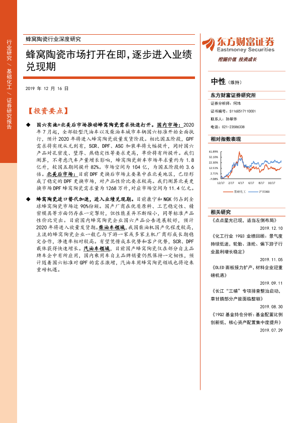 【东方财富证券】【20191216】蜂窝陶瓷行业深度研究:蜂窝陶瓷市场打开在即,逐步进入业绩兑现期-26页