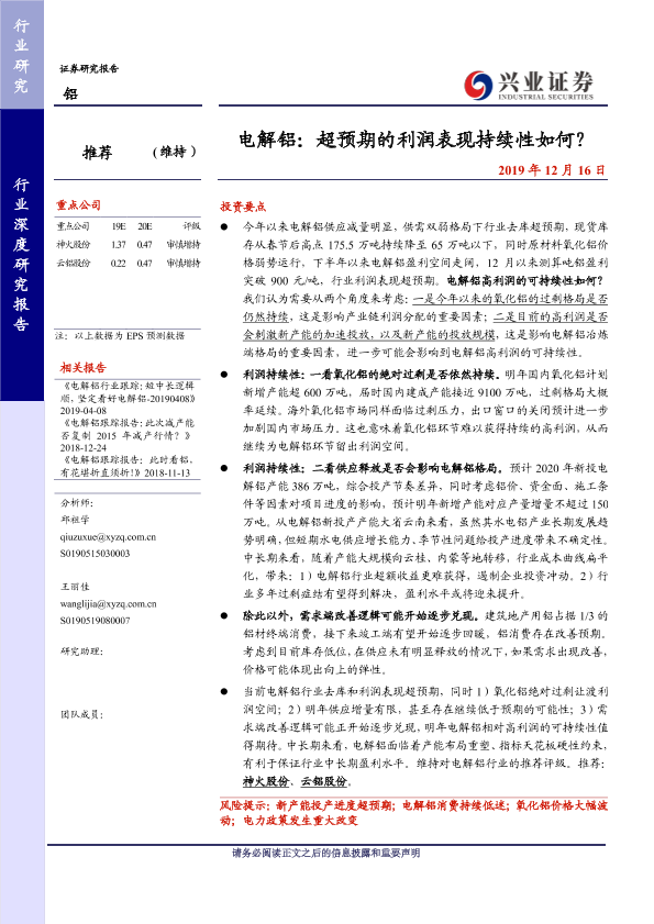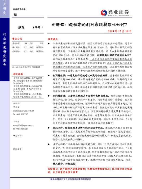 【兴业证券】【20191216】电解铝:超预期的利润表现持续性如何?-22页