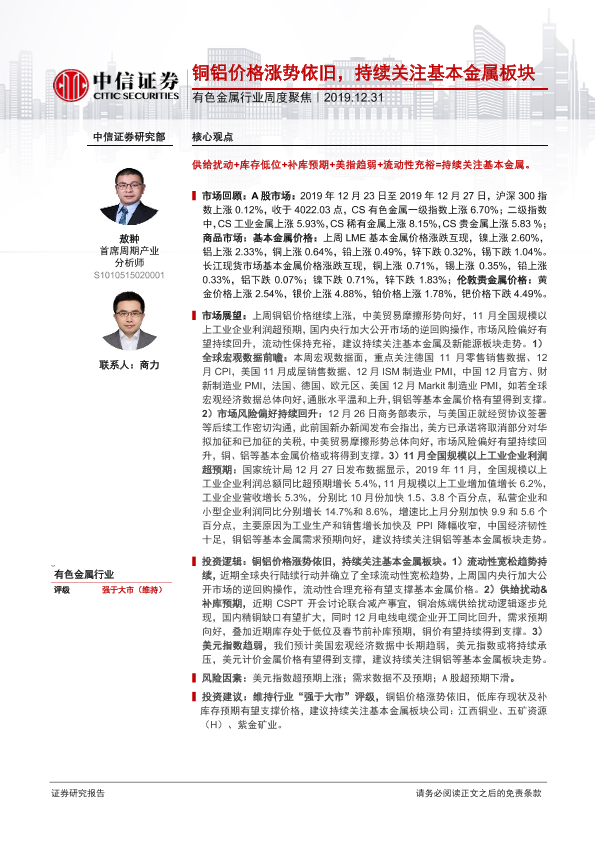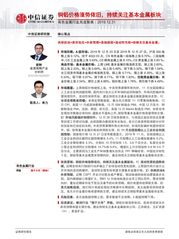 【中信证券】【20191231】20191231-中信证券-有色金属行业周度聚焦:铜铝价格涨势依旧,持续关注基本金属板块-16页