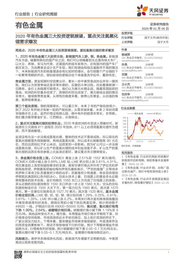 【天风证券】【20200105】2020年有色金属三大投资逻辑展望,重点关注氢氧化锂需求爆发-18页
