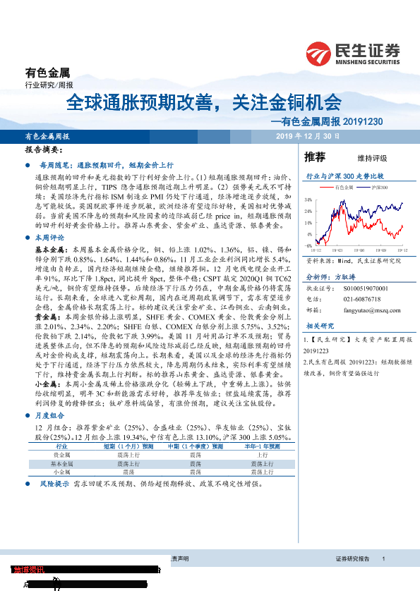 【民生证券】【20191230】全球通胀预期改善,关注金铜机会——有色金属周报 20191230-31页