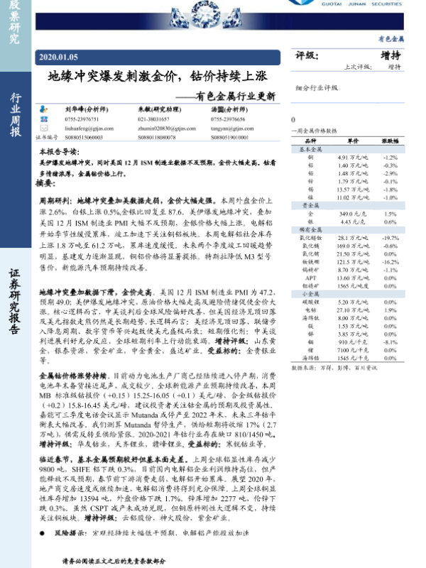 【国泰君安证券】【20200105】20200105-国泰君安-有色金属行业更新:地缘冲突爆发刺激金价,钴价持续上涨-13页