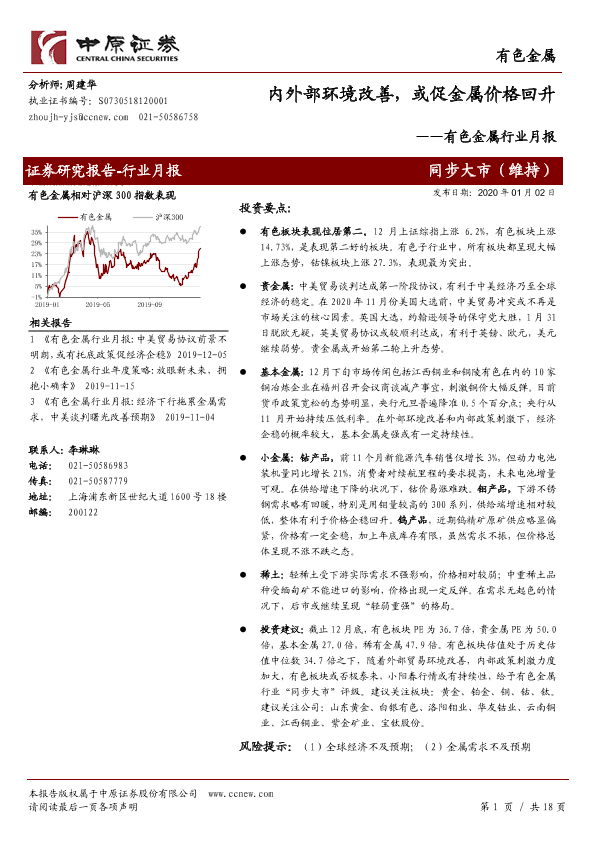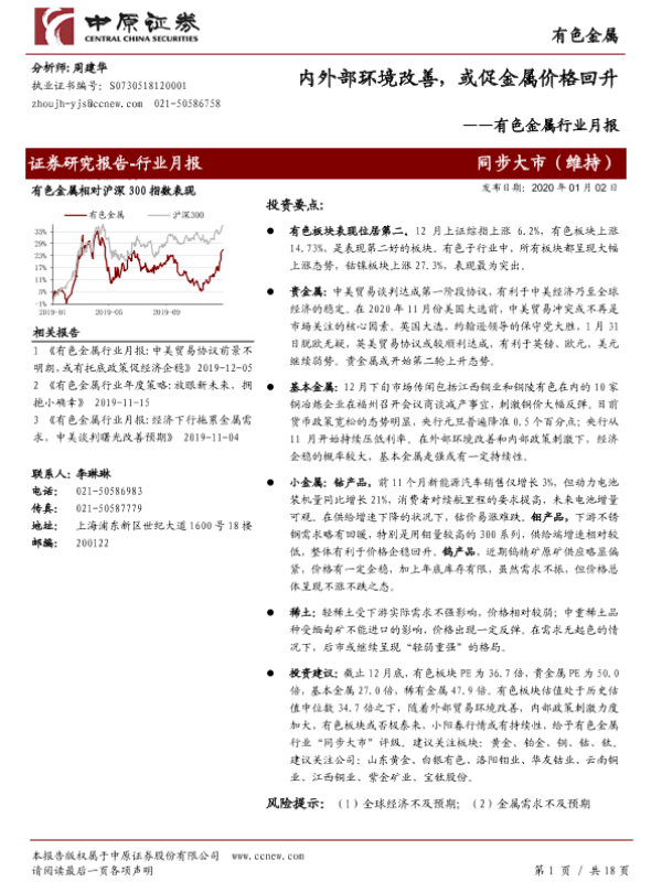 【中原证券】【20200102】20200102-中原证券-有色金属行业月报:内外部环境改善,或促金属价格回升-18页