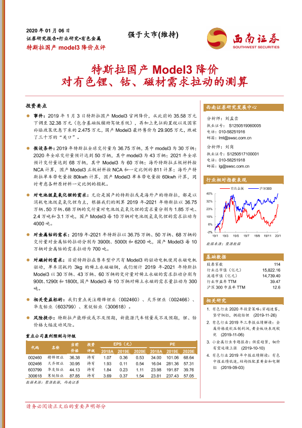 【西南证券】【20200106】特斯拉国产Model3降价-对有色锂、钴、磁材需求拉动的测算-3页
