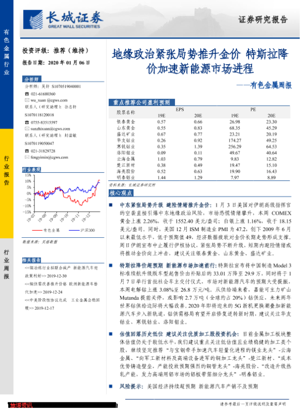 【长城证券】【20200106】20200106-长城证券-有色金属周报:地缘政治紧张局势推升金价 特斯拉降价加速新能源市场进程-11页