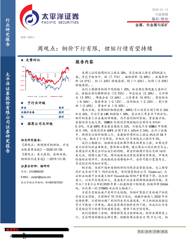 【太平洋证券】【20200112】20200112-太平洋-金属、非金属与采矿周观点:铜价下行有限,锂钴行情有望持续-4页