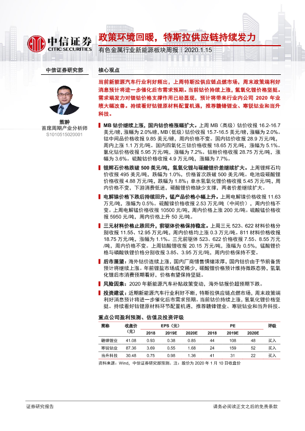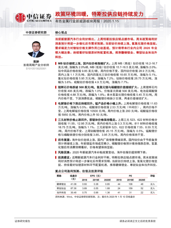 【中信证券】【20200115】有色金属行业新能源板块周报:政策环境回暖,特斯拉供应链持续发力-13页