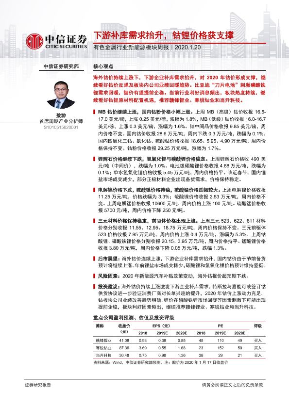 【中信证券】【20200120】20200120-中信证券-有色金属行业新能源板块周报:下游补库需求抬升,钴锂价格获支撑-13页