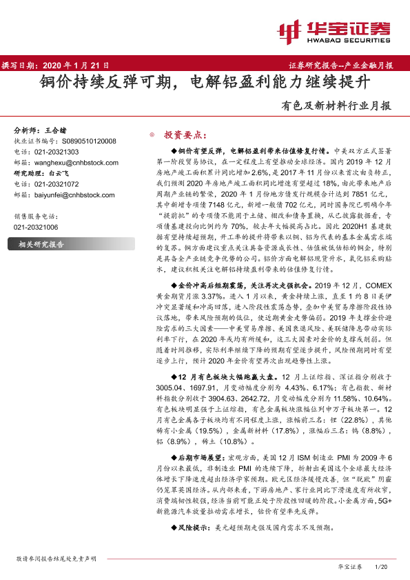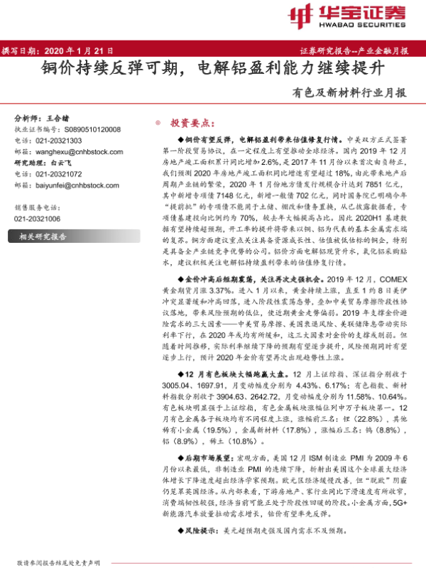 【华宝证券】【20200121】20200121-华宝证券-有色及新材料行业月报:铜价持续反弹可期,电解铝盈利能力继续提升-20页
