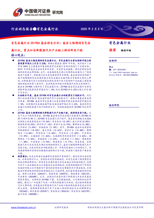 【银河证券】【20200205】有色金属行业2019Q4基金持仓分析:基金大幅增持有色金属行业,重点加仓新能源汽车产业链上游材料类个股-12页