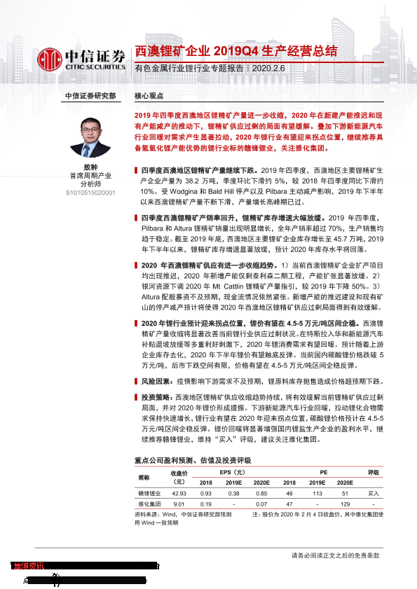 【中信证券】【20200206】20200206-中信证券-有色金属行业锂行业专题报告:西澳锂矿企业2019Q4生产经营总结-15页